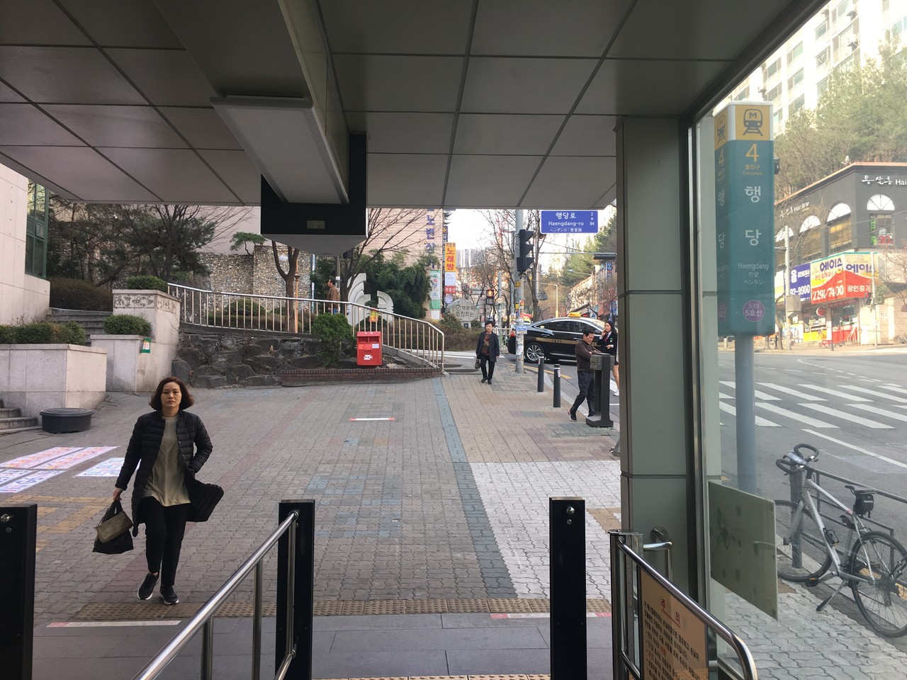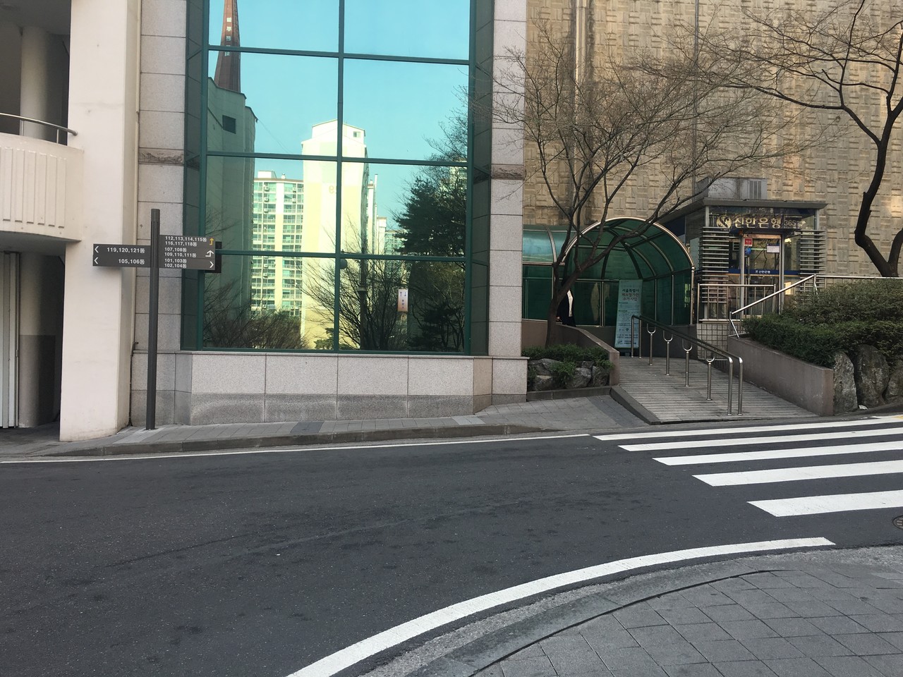 쭉 걸어오시면 앞에 유리가 보이는 건물 옆(신한은행 ATM기 사이) 입구로 들어오셔서 한진아파트 내 엘리베이터를 이용하시면 됩니다.