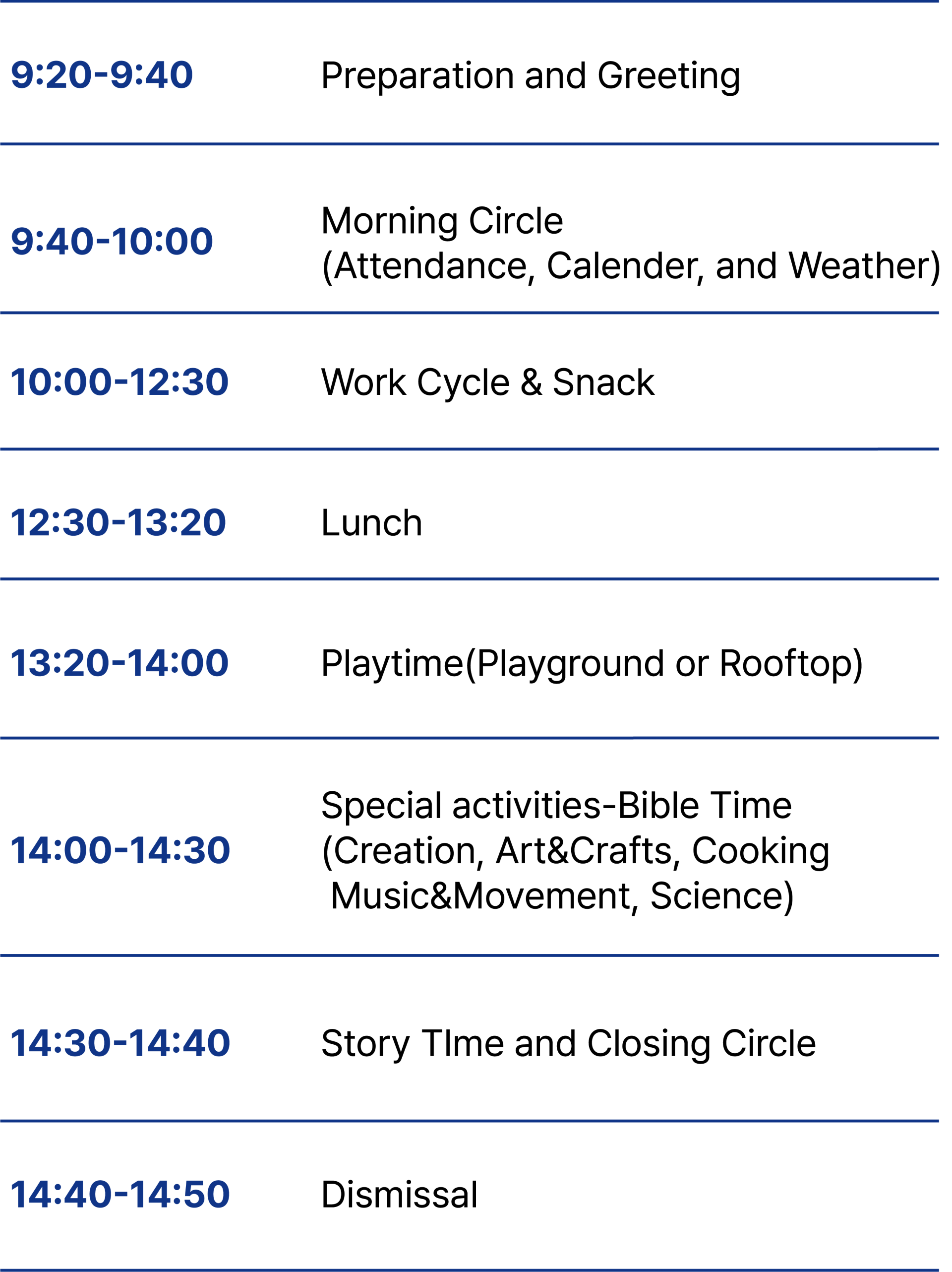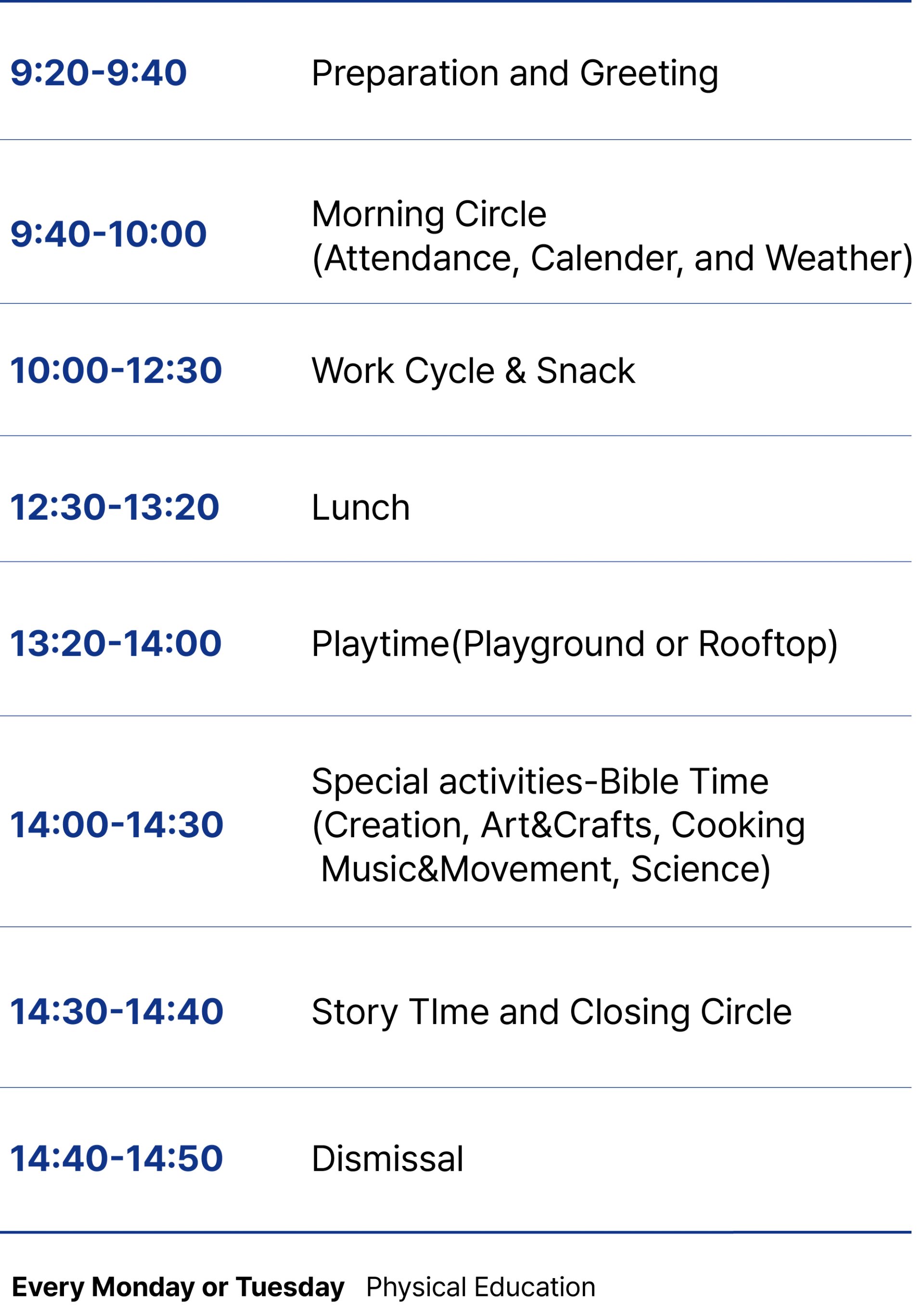 생활에 필요한 전반적인 자질을 연마하며 특히 집중력, 자립심, 질서감, 근육의 발달, 자기조절능력, 협동심을 배웁니다. 또한 건강한 생활과 올바른 인격형성을 위한 기초 인성을 발달 시켜주는 영역입니다.